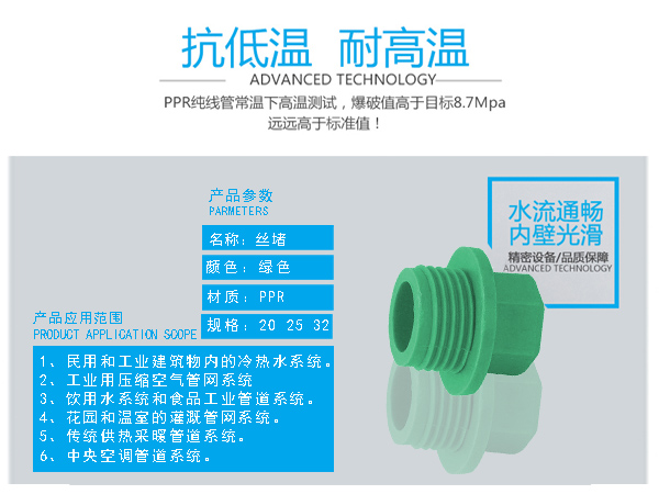 □ 管件連接牢固:由于聚丙烯具有良好的熱熔接性能,熱熔連接將同種材料制造的管材和管件連接成為一個(gè)整體,杜絕了漏水的隱患。