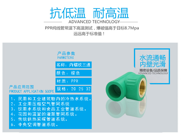 □ 管件連接牢固:由于聚丙烯具有良好的熱熔接性能,熱熔連接將同種材料制造的管材和管件連接成為一個整體,杜絕了漏水的隱患。