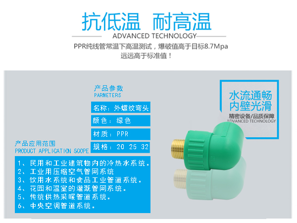 □ 管件連接牢固:由于聚丙烯具有良好的熱熔接性能,熱熔連接將同種材料制造的管材和管件連接成為一個整體,杜絕了漏水的隱患。